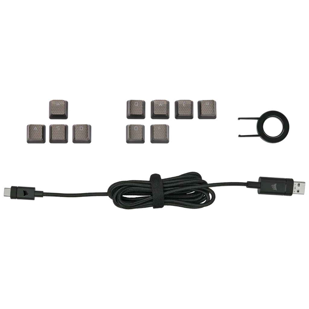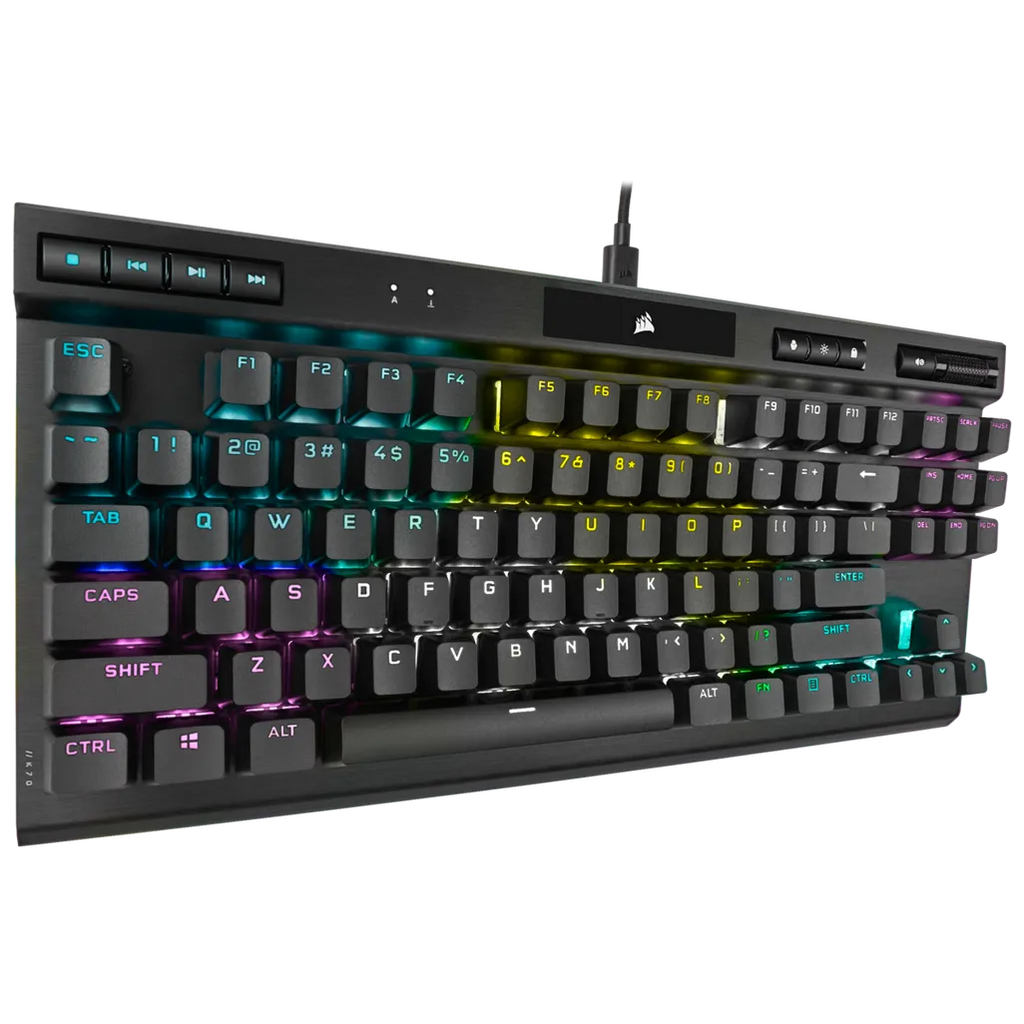 Corsair K70 RGB TKL. Keyboard form factor: Tenkeyless (80 - 87%). Keyboard style: Straight. Connectivity technology: Wired, Device interface: USB, Keyboard key switch: Mechanical, Keyboard layout: QWERTY, Keyboard number of keys: 88. Backlight type: RGB LED. Recommended usage: Gaming. Product colour: Black