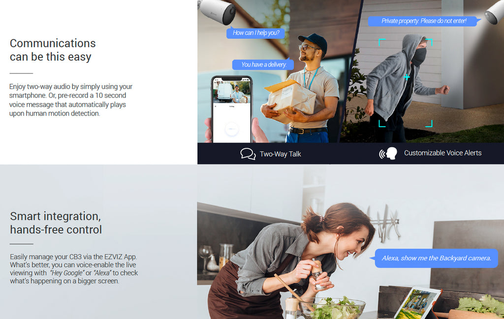 - Easily manage your CB3 via the EZVIZ App. What’s better, you can voice-enable the live viewing with “Hey Google” or “Alexa” to check what’s happening on a bigger screen