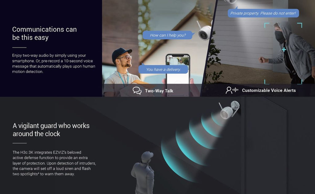 The H3c 3K integrates EZVIZ's beloved active defense function to provide an extra layer of protection. Upon detection of intruders, the camera will set off a loud siren and flash two spotlights to warn them away.