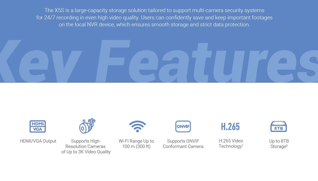 The X5S NVR is designed to manage large-scale videos generated from security needs. In addition to a storage capacity that can be expanded to 8TB, the X5S also receives data and video files from up to 8 connected Wi-Fi cameras at the same time.