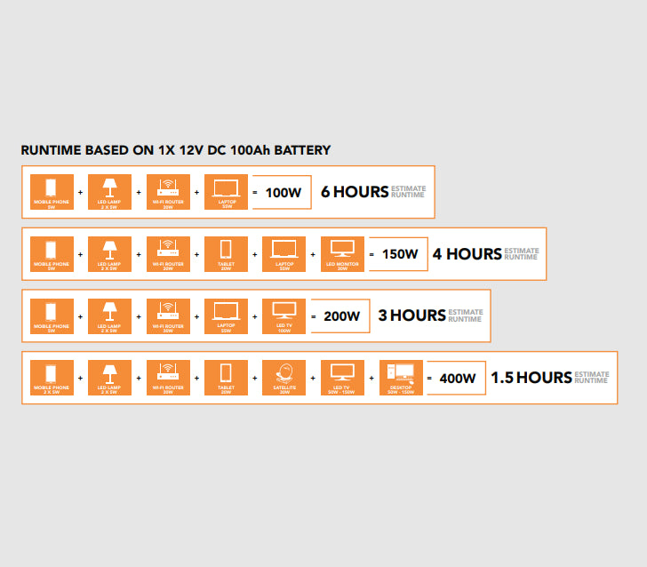 Output Ac Output: 2 X Sa 3 Pin Socket - 230 V 50 Hz, 2000 Va / 2000 W Max. (Combined) Usb Output: 2 X Usb Type A Port - 5 Vdc 2 A Max. Dc Output: 2 X 12 V Dc Port 2 A Max. Battery Type: 1 X 12 Dc 100 Ah Deep Cycle Vrla Gel Battery